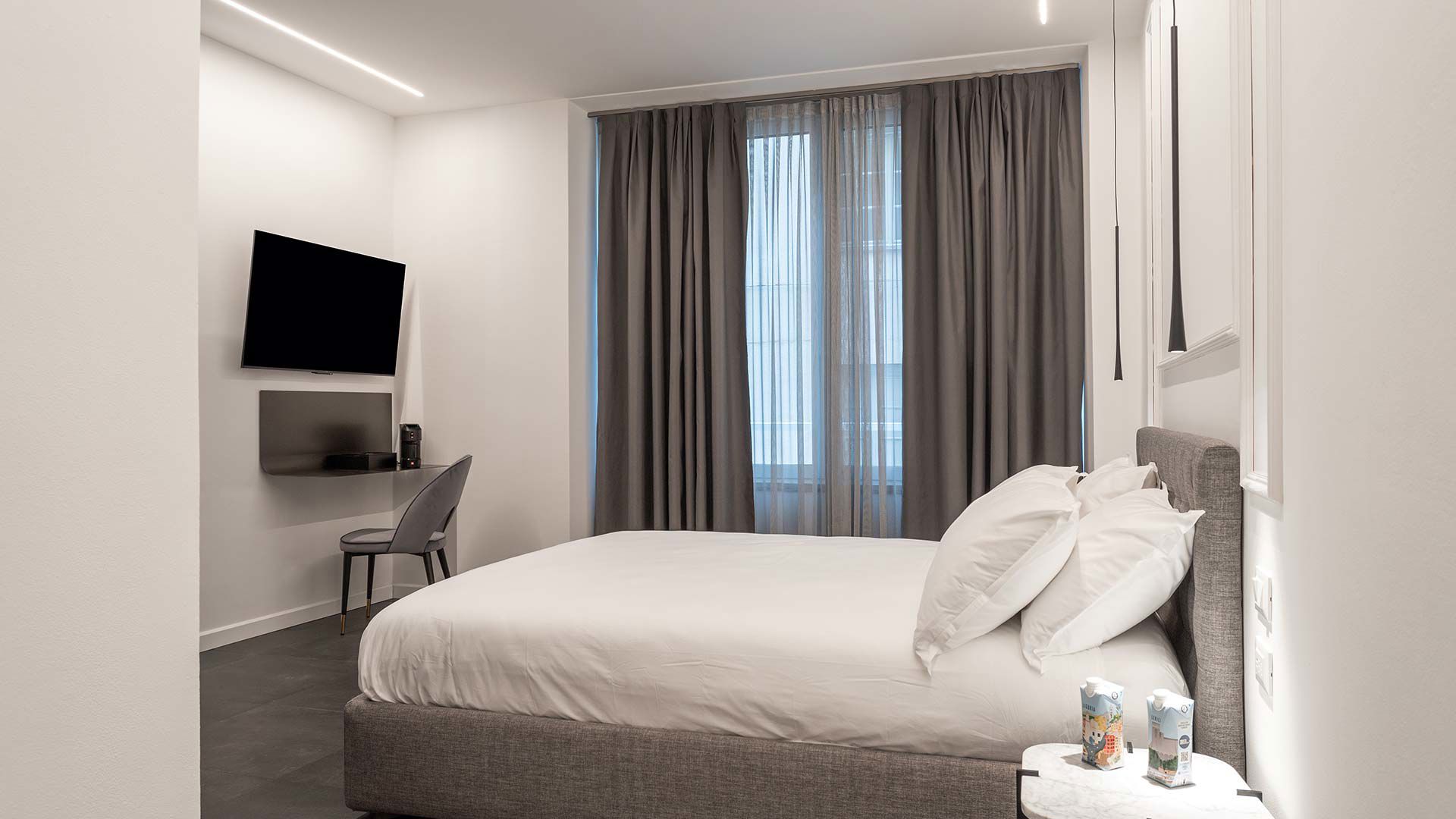 Gli arredi moderni e le finiture di pregio conferiscono alla stanza un carattere sobrio ma ricercato. Il letto matrimoniale, con materasso di alta qualità e biancheria pregiata, è l’ideale per un riposo profondo e rigenerante, garantendo il massimo benessere in ogni momento del soggiorno.